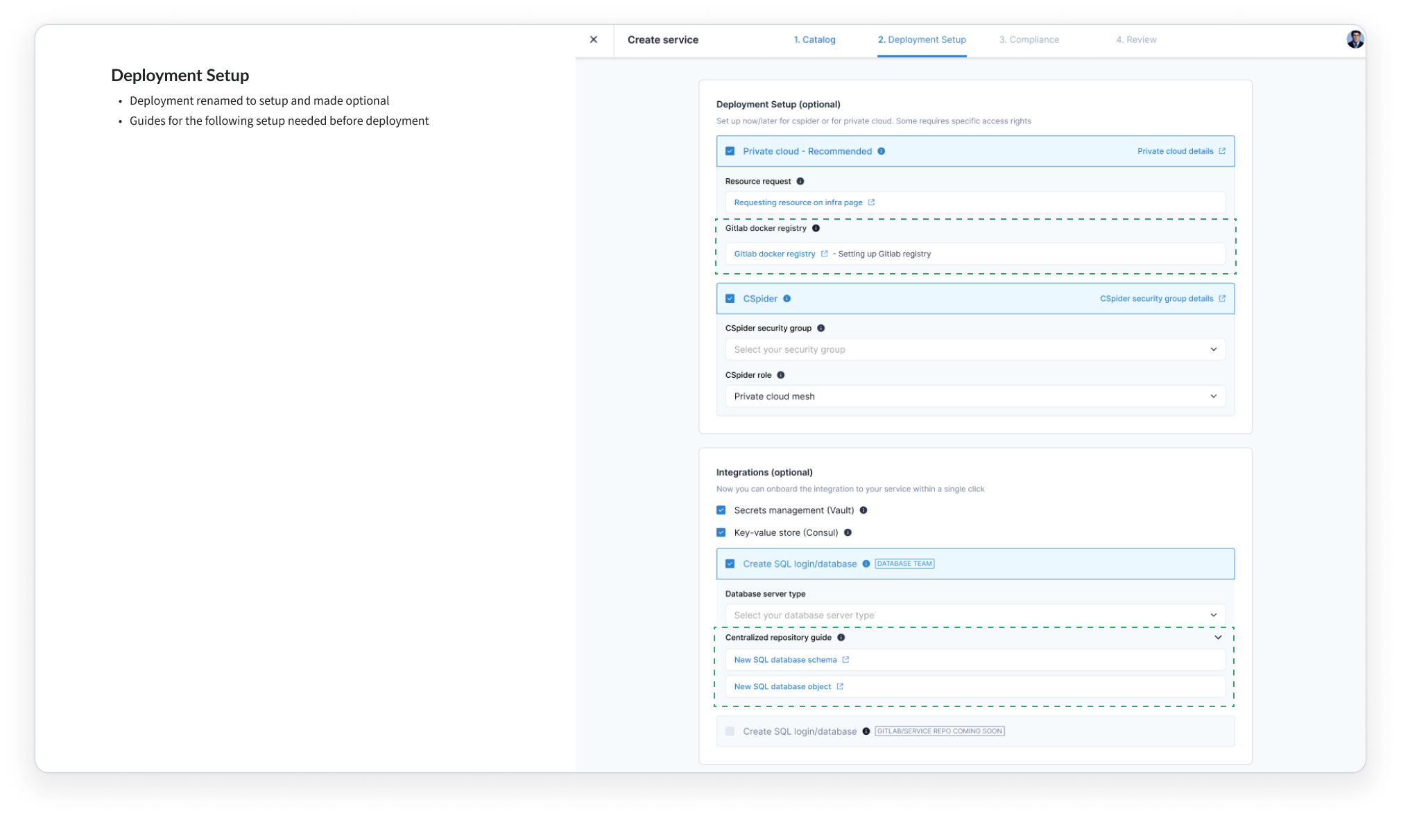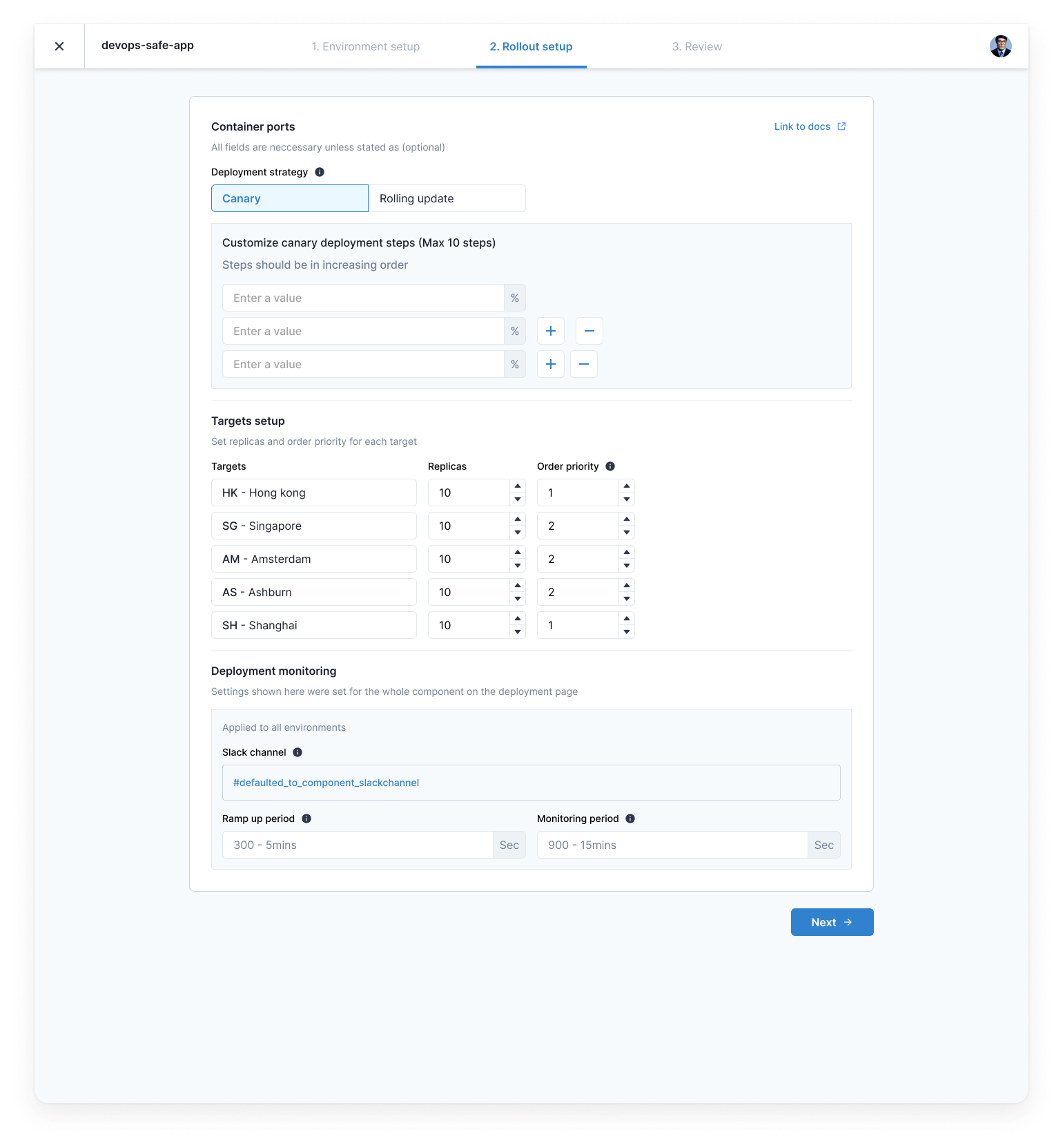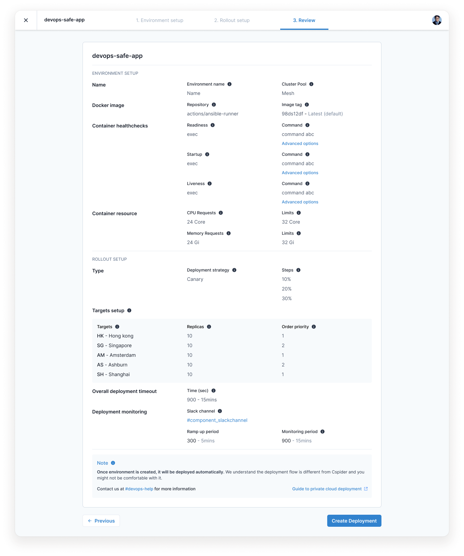 Focused on sequential setup, environment to data centre selection and finally reviewing before deploying. Designed while discussing with tech leads closely along the way.